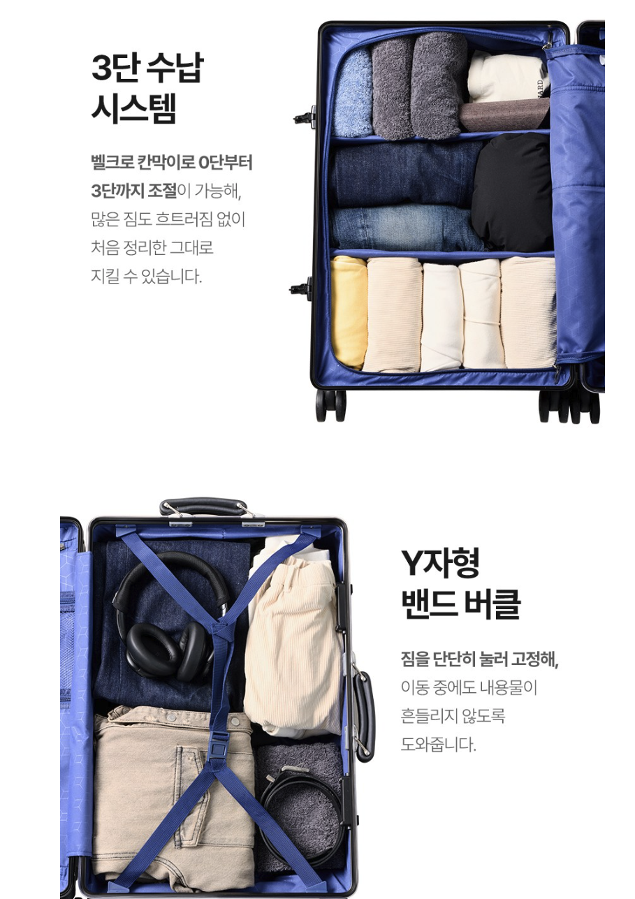 → 여행에서 중요한 조건을 한 번에 충족합니다. - 내부도 한쪽은 Y자 고정 밴드, 한쪽은 접이식 칸막이(벨크로 고정) 구성이라 짐 정리 효율이 좋아요.