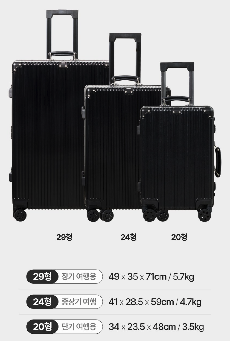 | 20인치 | 34×48×23.5cm | 3.5kg | 기내용/짧은 출장 |